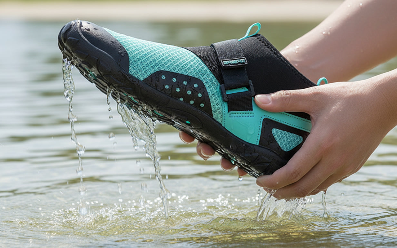 L'eau s'évacue facilement par de petits trous au fond. Les pieds restent secs et frais, même après avoir éclaboussé ou nagé.