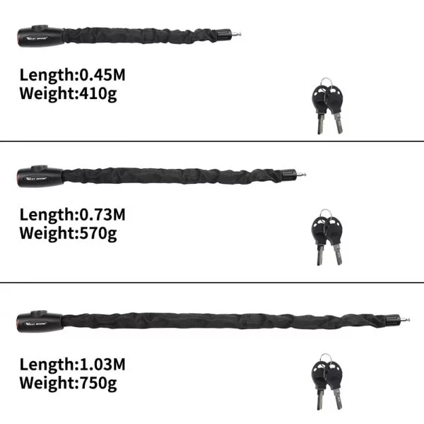 La chaîne renforcée allongée en acier allié haute résistance est plus longue et plus pratique. Disponible en différentes longueurs : 0,45 m – 1,45 m. Une clé en forme de croissant réduit efficacement le taux d’ouverture mutuelle et résiste aux méthodes des voleurs. Cet antivol peut sécuriser plusieurs vélos ou motos simultanément. Il peut aussi être utilisé pour des échelles, portails, clôtures, boîtes à outils, équipements sportifs et autres objets importants. Parfait pour attacher votre vélo à un arbre ou une rambarde.