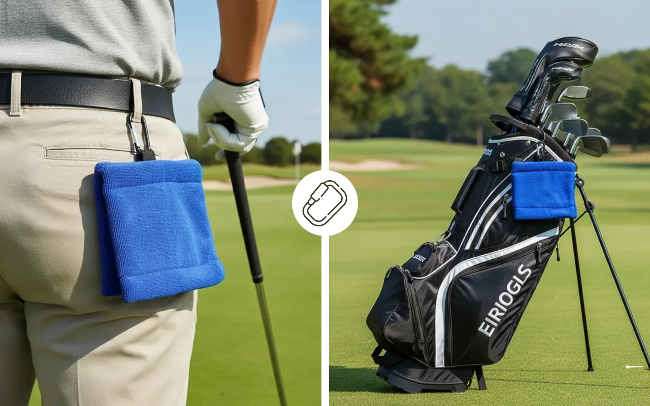J’adore vraiment le mousqueton, il s’attache à ma ceinture en quelques secondes. Le tissu microfibre est doux mais enlève parfaitement la boue sur les balles et les clubs.