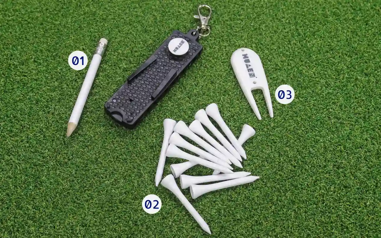Douze tees, un marqueur, un crayon et une fourchette restent ensemble. Fini les accessoires renversés ou oubliés.