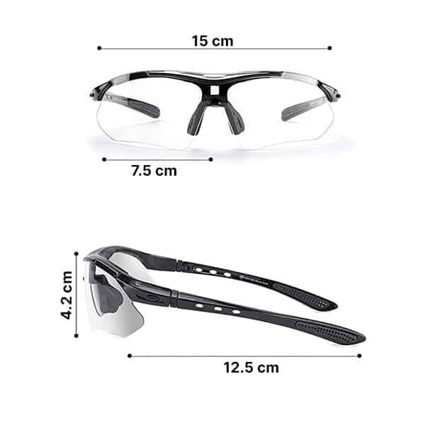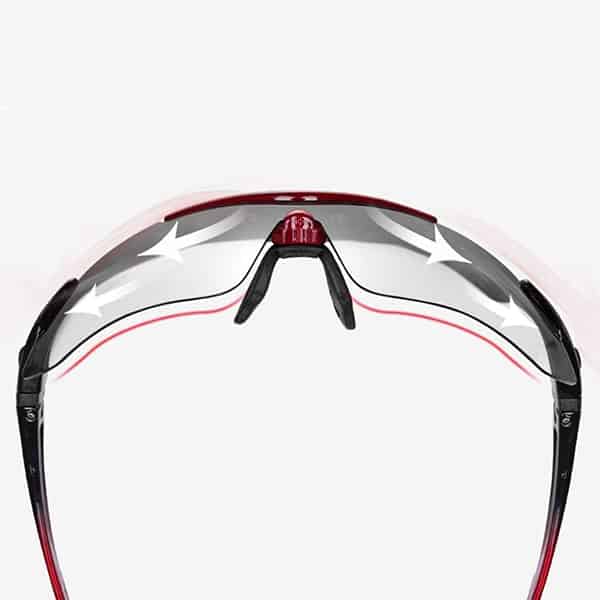 Les lunettes de vélo photochromiques THREO protègent parfaitement votre vision contre les rayons du soleil. Les verres ajustent automatiquement le niveau d’obscurité et de luminosité en fonction des différents degrés de rayonnement ultraviolet. De plus, nos lunettes offrent une parfaite adaptation à toutes les conditions de lumière et météorologiques. Grâce à cette technologie, vous n’aurez jamais besoin de changer de lunettes lors de vos activités en extérieur. En outre, les verres larges offrent un champ de vision élargi et protègent vos yeux du vent, de la poussière et des moustiques.