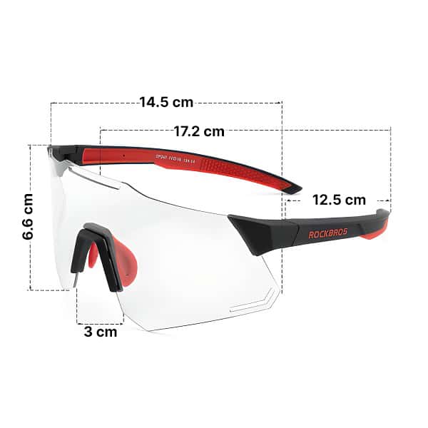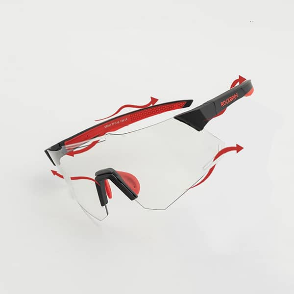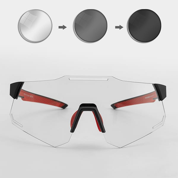Les lunettes de cyclisme photochromiques THREO protègent parfaitement votre vision contre la lumière du soleil. Les verres ajustent automatiquement leur niveau d’obscurité et de luminosité en fonction des différents degrés de rayonnement ultraviolet. De plus, nos lunettes offrent une adaptation parfaite à toutes les conditions de lumière et météorologiques. Grâce à cette technologie, vous n’aurez jamais besoin de changer de lunettes lors de vos activités en extérieur. En outre, les verres larges offrent un champ de vision élargi et protègent vos yeux du vent, de la poussière et des moustiques.