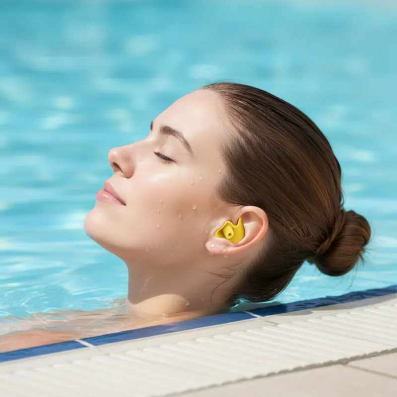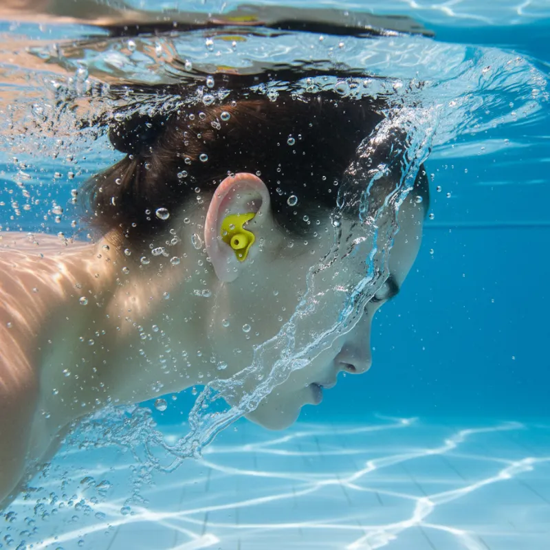 Le silicone flexible s'adapte délicatement à chaque forme d'oreille, rapidement. Même les longues baignades restent agréables, sans irritation ni pression.