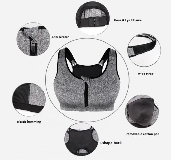 La bretelle arrière en forme de I protège efficacement contre les chocs et empêche la brassière de bouger ou de glisser. La brassière est équipée d’une fermeture éclair anti-glissement et de crochets qui empêchent de glisser vers le bas pendant l’exercice. La bande de soutien ajustable à l’arrière, comme une brassière classique avec 3 rangées d’agrafes, permet d’ajuster la taille des bonnets.