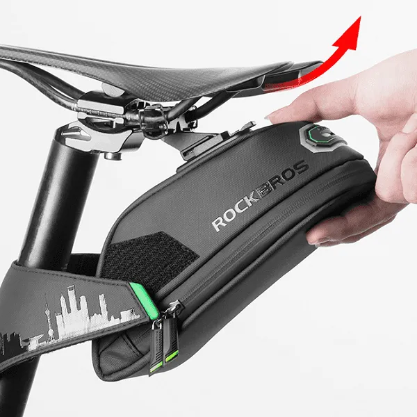 Notre sacoche de vélo est dotée d'une sangle en caoutchouc qui vous permet de fixer une lampe à la selle pour une meilleure visibilité et sécurité sur la route en conditions de faible luminosité.